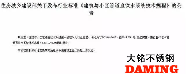 此外,近期住房城鄉(xiāng)關(guān)于發(fā)布行業(yè)標(biāo)準(zhǔn)《建筑與小區(qū)管道直飲水系統(tǒng)技術(shù)規(guī)程》的公告:批準(zhǔn)《建筑與小區(qū)管道直飲水系統(tǒng)技術(shù)規(guī)程》為行業(yè)標(biāo)準(zhǔn),編號(hào)為CJJ/T110-2017,自2017年11月1日起實(shí)施。規(guī)程中規(guī)定:管材應(yīng)選用雨花區(qū)304不銹鋼薄壁水管、銅管等符合食品級(jí)要求的管材。一系列跡象表明,不銹鋼水管時(shí)代正在到來(lái)。